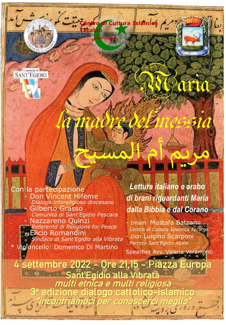 Lunedì 4 settembre, vivremo un momento importante riconoscendo Sant’Egidio città multietnica e multireligiosa: sono molte le famiglie musulmane! Per il terzo anno consecutivo, collaborando con l’Imam Batzami, vivremo una serata di dialogo cattolico-islamico ‘incontriamoci per conoscerci meglio’, atteggiamento alla base del rispetto nella diversità e convivenza costruendo la civiltà dell’integrazione. Dopo aver ascoltato nella doppia lingua il documento di Abu Dhabi firmato da Papa Francesco e dall’Imam di Al Azar e aver scoperto ‘Abramo nostro padre nella fede’ leggendo brani dal Corano e dalla Bibbia, quest’anno, al suono caldo, intenso e vibrante del violoncello, ci soffermeremo sulla figura di ‘Maria madre del Messia’, molto esaltata nel Corano, ascoltando brani in arabo e brani dai Vangeli in italiano. La serata si concluderà degustando dolci e vivande dei rispettivi paesi”.