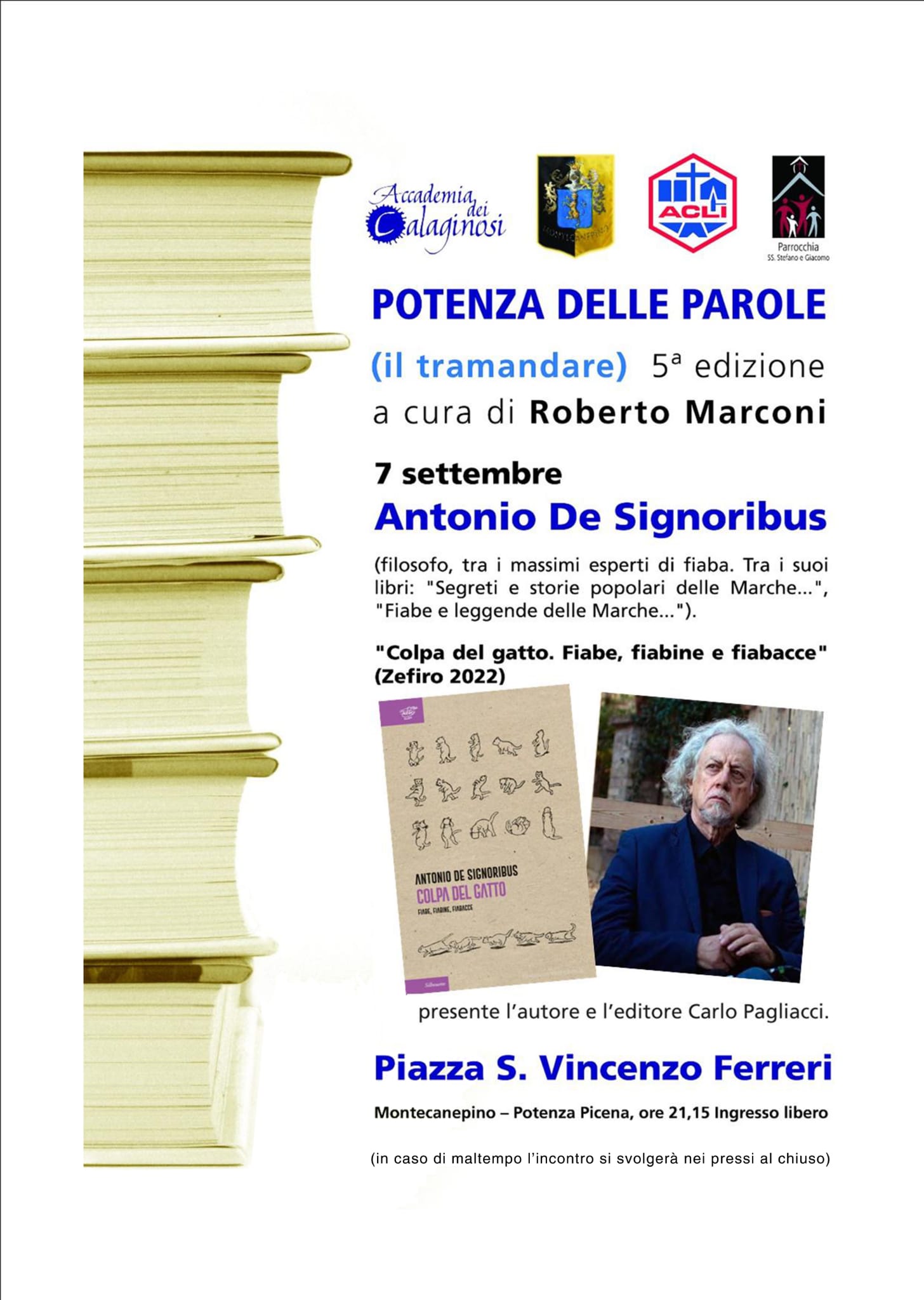 Con un viaggio irresistibile nel mondo della parola fiabesca Antonio De Signoribus, filosofo/scrittore nonché Maestro di fiabistica internazionale, ci farà conoscere il vero senso che si nasconde dentro la magia della fiaba, attraverso il bel libro “ Colpa del Gatto. Fiabe, fiabine, fiabacce”(Zefiro, 2022). Parlando di linguaggio sentiamo cosa dice Francesco Liberati nella prefazione al libro: “Il linguaggio di Antonio De Signoribus, in questa ultima pubblicazione, si fa ancora più incalzante, memore di antiche forme e risonanze e, al contempo, incredibilmente attuale e in grado di veicolare stati psicologici e situazioni con sfumature di assoluta contemporaneità…”. Converserà con l’autore Roberto Marconi, ideatore della importante Rassegna giunta alla quinta edizione. Interverrà l’editore Carlo Pagliacci. Le fiabe di Antonio De Signoribus, pur narrando avvenimenti di pura finzione, che accadono in un mondo irreale; comunicano tuttavia un senso alle esperienze fondamentali della vita, ovvero danno fiducia nell’ affrontarla, attraverso il gioco narrativo e il prodigio, quintessenza di ogni estremo, culmine massimo dello stile fiabesco. Con un tocco magico lo scrittore, grande e riconosciuto affabulatore, entrerà davvero nel cuore del discorso è ci farà capire che la fiaba popolare è una manifestazione umana molto seria e di valore universale,che accompagna da sempre la storia dell’uomo. Per questo esige rispetto.