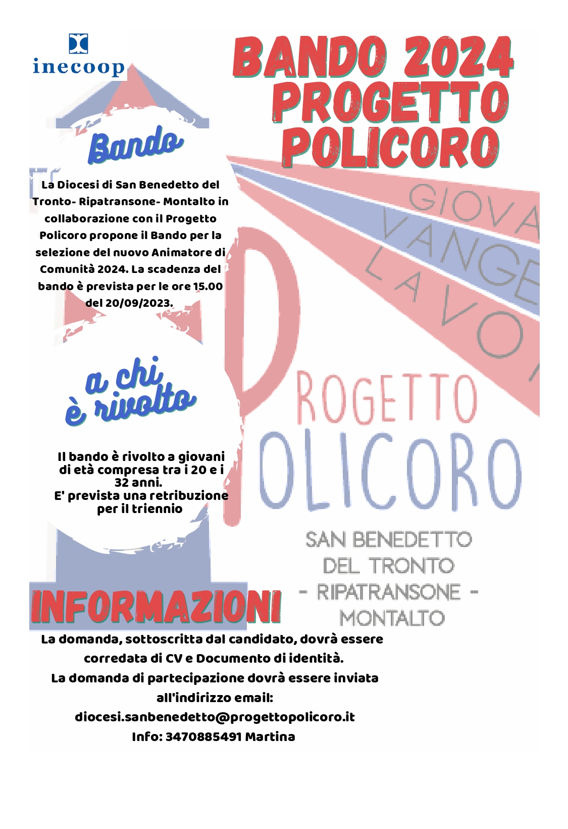 Per info: 3470885491 Martina oppure tramite email all’indirizzo diocesi.sanbenedetto@progettopolicoro.it