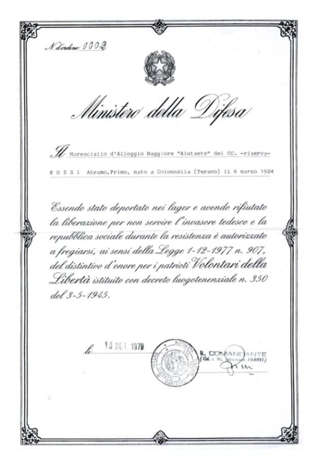 COLONNELLA – Era l’8 Settembre 1943, quando fu annunciato l’armistizio tra l’Italia e le Forze Angloamericane, un atto che segnò la fine della Guerra condotta al fianco della Germania di Hitler e diede inizio ad una nuova fase storica che vide i nazisti attuare il loro piano di occupazione della penisola italiana, mentre le Formazioni Partigiane cominciavano ad organizzare la Resistenza. L’improvviso sfaldamento delle strutture di comando dell’Esercito Italiano consentì ai Tedeschi la cattura di centinaia di migliaia di militari italiani, che furono deportati e internati, assieme a tantissimi civili, nei campi di concentramento nazisti. Tra questi c’era anche Abramo Rossi, un giovane di Colonnella che all’epoca si trovava in servizio come Carabiniere a cavallo presso il I° Squadrone nella Legione Allievi Carabinieri di Roma.