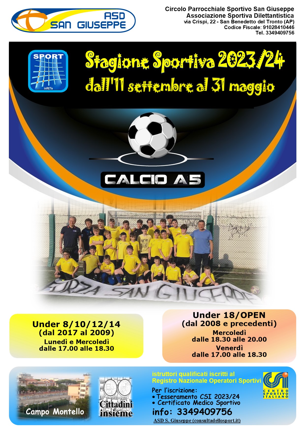 SAN BENEDETTO DEL TRONTO – L’11 settembre ha preso il via la nuova stagione 2023-24 con l’attività sportiva didattica di calcio a5 (futsal). Questa disciplina è riconosciuta dal CONI ed è uno degli strumenti pedagogici principali promossi dall’associazione dal 2006 attraverso il Progetto “SportinRETe” (Sport in Rete Educativa Territoriale).