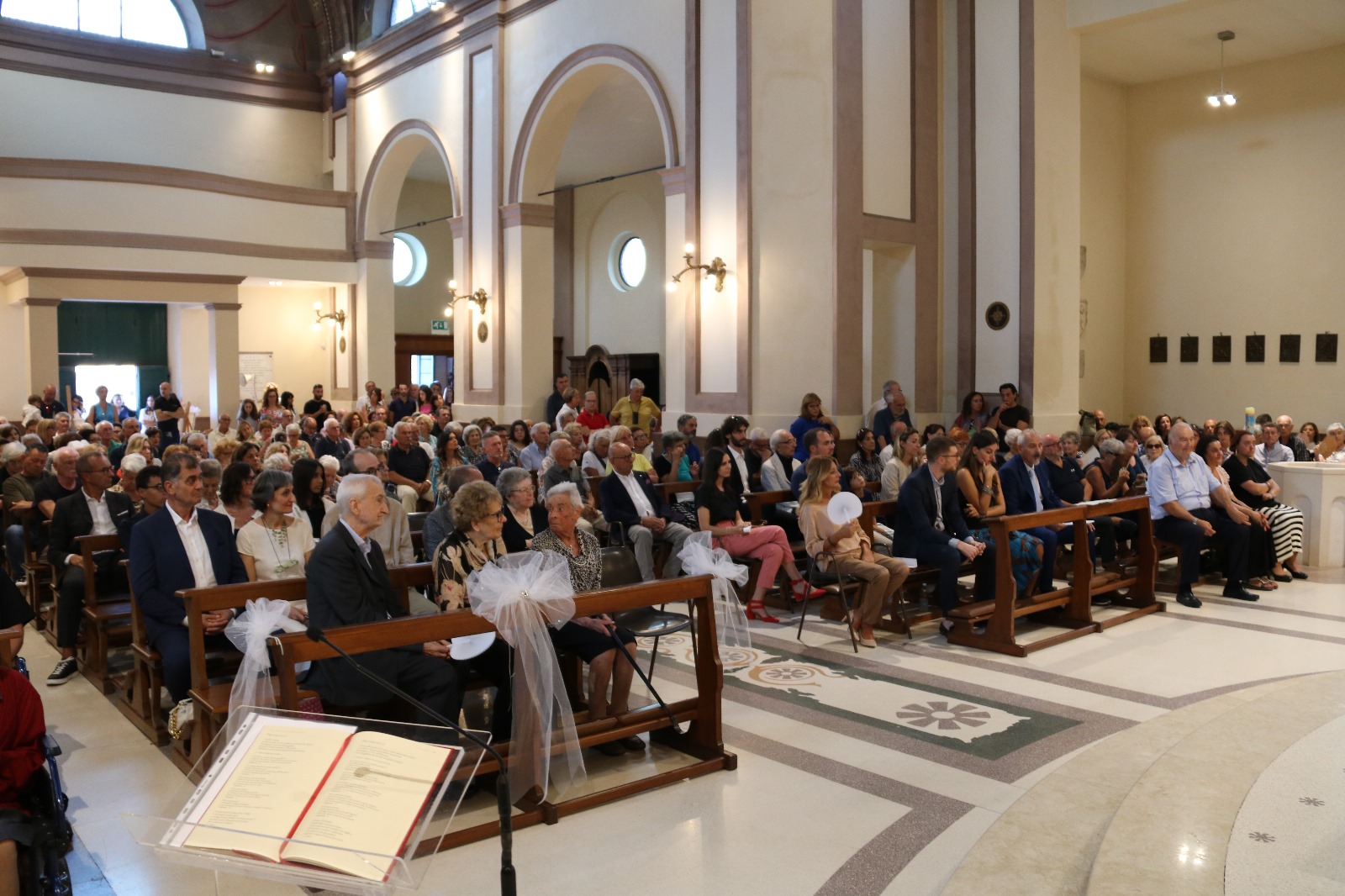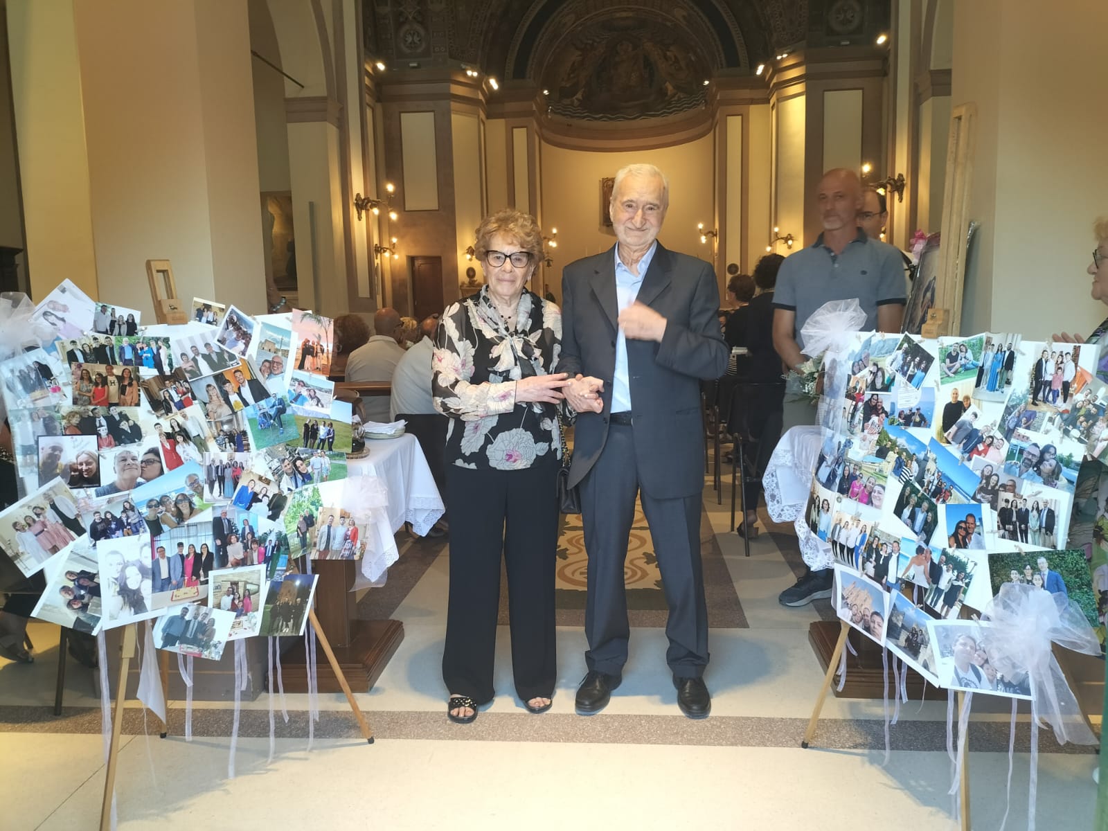 Due grandi tele all’ingresso della Chiesa, hanno raccolto le foto di circa un centinaio di famiglie, “ex coppie dei corsi per fidanzati” (anche di coloro che non hanno potuto partecipare alla celebrazione) a testimonianza dell’affetto, della gratitudine e della stima a Nazzareno e Rosina, che sono stati e continuano ad essere esempio vivo e concreto dell’Amore di Dio in terra, ma anche della fedeltà, della costanza e dell’impegno che occorrono perché una famiglia possa “resistere” alle intemperie della vita.