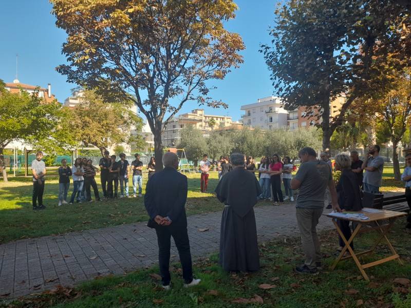 DIOCESI – “San Giuseppe da Copertino, protettore degli studenti, diceva che gli uomini a volte contemplano la natura per la sua bellezza, ma non contemplano Colui che l’ha creata! Per non essere stolti, dunque, bisognerebbe che le meraviglie della natura fossero per noi come degli occhiali, ovvero degli strumenti che ci permettano di vedere meglio il loro creatore, il nostro Dio. San Francesco se n’era accorto! È per tale ragione che ha scritto il Cantico delle Creature, nel quale alza la sua lode di ringraziamento al Signore. Molti ritengono che San Francesco fosse un santo originale. Ma cosa significa essere originali? Ce lo spiega Antoni Gaudì, l’artista che ha progettato la Sagrada Familia a Barcellona e molti altri palazzi della città della Catalogna. Egli, che è stato definito l’architetto di Dio e che di originalità si intendeva parecchio, affermava che essere originali significa rifarsi all’origine: è per questo motivo che la sua architettura parte dalla contemplazione della bellezza del Creato”. È con queste parole di fra’ Roberto Brunelli che si è aperto l’incontro organizzato dall’Ufficio di Pastorale Sociale, del Lavoro e della Cura del Creato della Diocesi di San Benedetto del Tronto – Ripatransone – Montalto in occasione della festa liturgica di San Francesco d’Assisi, patrono d’Italia. L’appuntamento, avvenuto mercoledì 4 ottobre, alle ore 11:30, presso il Parco Carol Woytila in San Benedetto del Tronto, ha registrato la partecipazione degli studenti delle classi quarte del Liceo Scientifico Benedetto Rosetti, accompagnati da alcuni docenti di Religione e di Arte.