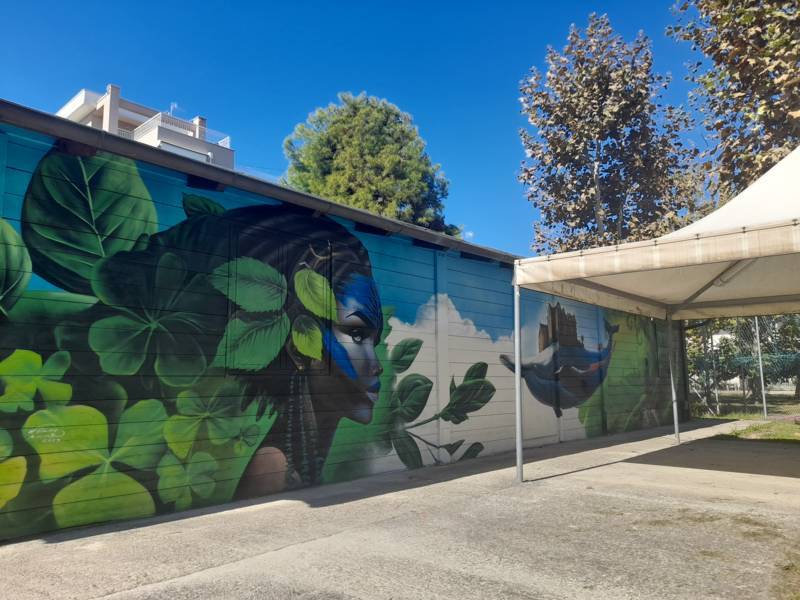 L’artista Kaine ha invece spiegato il significato del suo dipinto: “L’opera è nata con il preciso intento di sensibilizzare gli ospiti del parco alla cura dell’ambiente e all’inclusione. Ho raffigurato una donna di colore, una sorta di Madre Natura, di fianco ad una città, che potrebbe essere la nostra San Benedetto, ma anche ogni città del mondo, che si trova sopra ad una balena che rappresenta il nostro pianeta, non un pezzo di roccia come siamo abituati a considerarlo, bensì vivo, in movimento. Se muore il nostro pianeta, moriamo anche noi. Dietro c’è una fenice, simbolo di rinascita: tutti infatti ci auguriamo che, attraverso una nostra conversione ecologica, il nostro pianeta possa rinascere a vita nuova“.