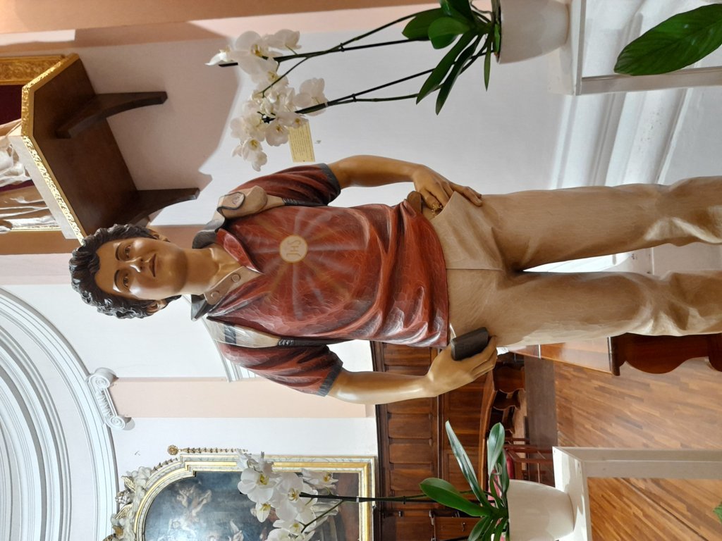 Il Beato Carlo Acutis, raffigurato nella statua con un rosario in tasca, recitava ogni giorno la preghiera alla Madonna e viveva l’Adorazione Eucaristica Perpetua. Egli affermava: “Ci si mette di fronte al sole e ci si abbronza … ma, quando ci si mette dinanzi a Gesù Eucaristia, si diventa santi”.