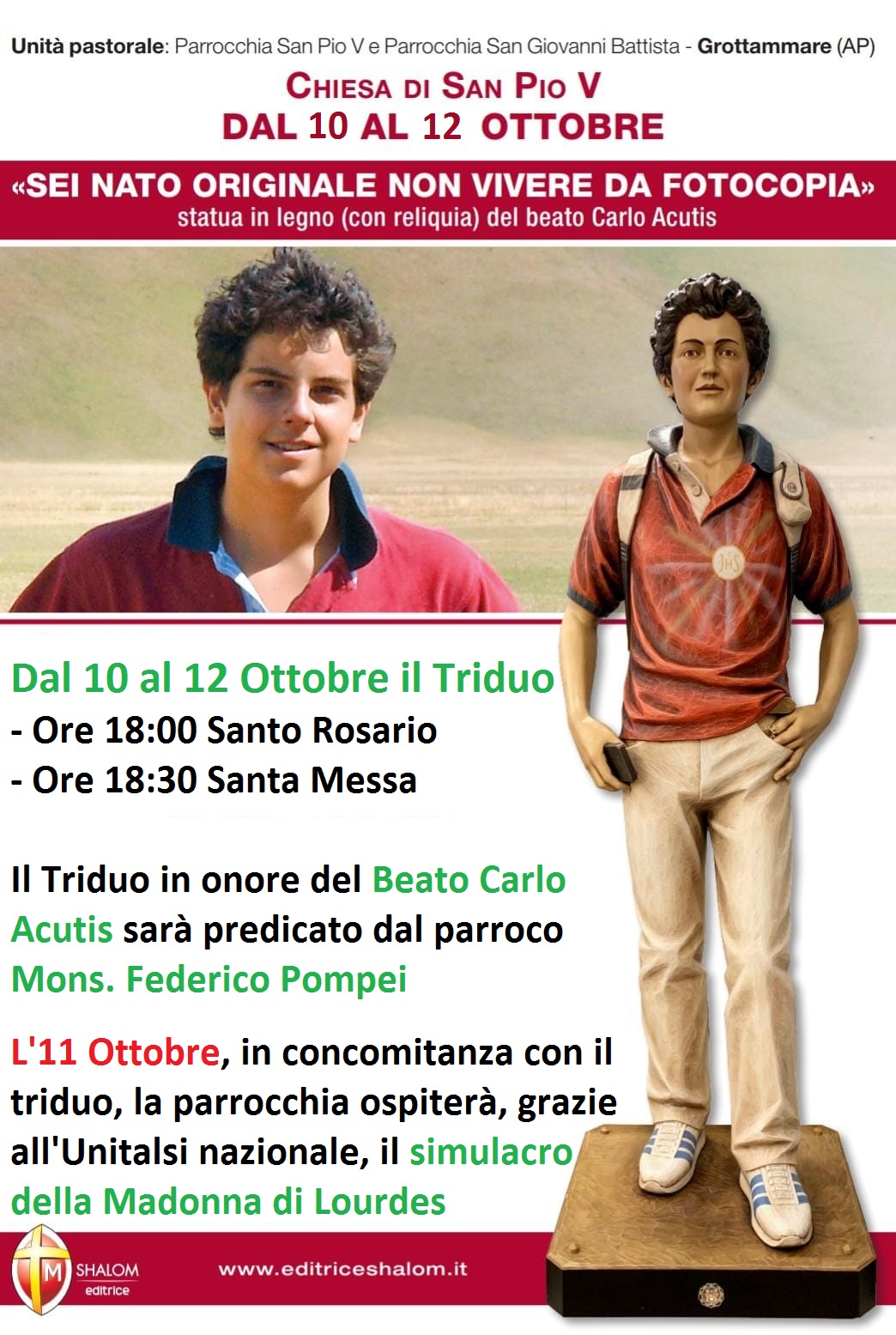 GROTTAMMARE – Dal 10 al 12 ottobre 2023, presso la Chiesa San Pio V in Grottammare, si terrà il triduo di preghiere in onore del Beato Carlo Acutis. Si inizierà in concomitanza con l’anniversario della Beatificazione del giovane e si concluderà nel giorno della sua nascita in cielo, avvenuta il 12 ottobre 2006.