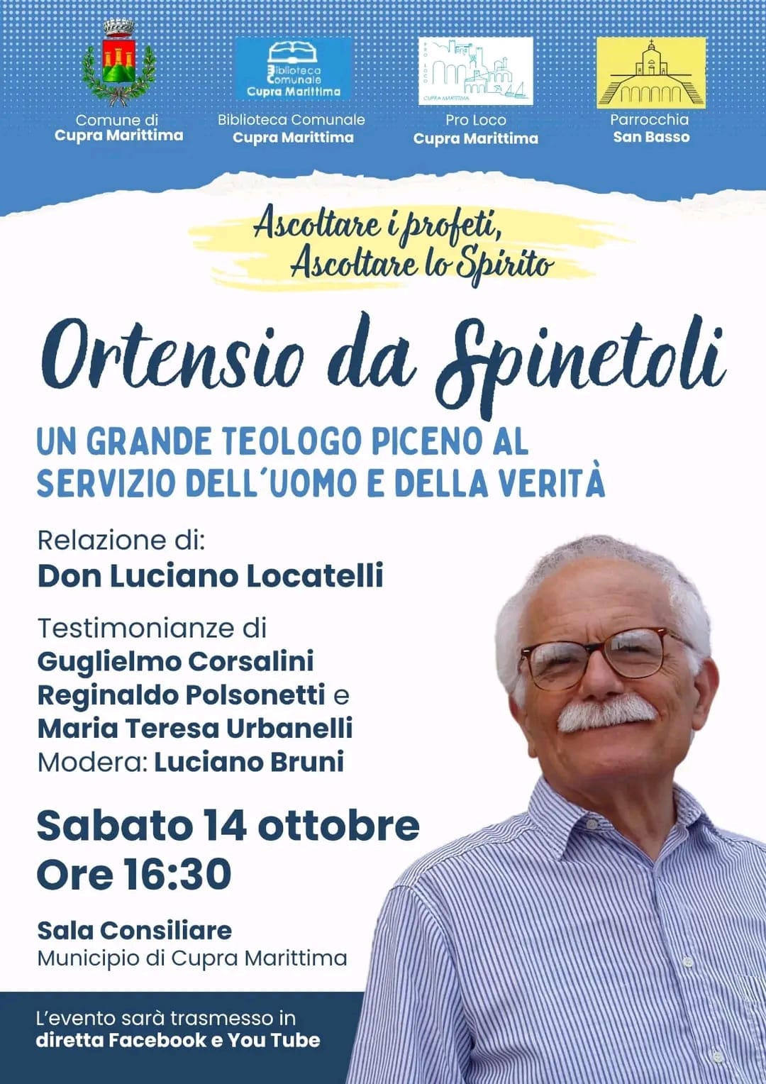 Dei contenuti espressi da Ortensio ne parlerà Don Luciano Locatelli, suo allievo e oggi responsabile Caritas a Bergamo, ed ci saranno anche le testimonianze di chi lo ha conosciuto a Montefano come Guglielmo Corsalini e Reginaldo Polsonetti, e della nipote Maria Teresa Urbanelli. Modera Luciano Bruni. L’incontro è Patrocinato dal Comune di Cupra Marittima, la Pro-Loco e la biblioteca comunale, la cooperativa Innova e la Parrocchia S. Basso di Cupra Marittima.