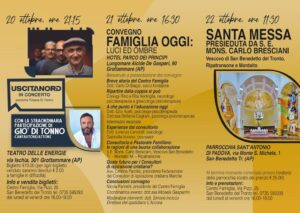 La giornata di sabato 21 ottobre, invece, sarà completamente dedicata alla riflessione. Presso l’hotel Parco dei Principi di Grottammare, alle ore 16:00, si terrà il Convegno dal titolo “Famiglia oggi: luci ed ombre”.