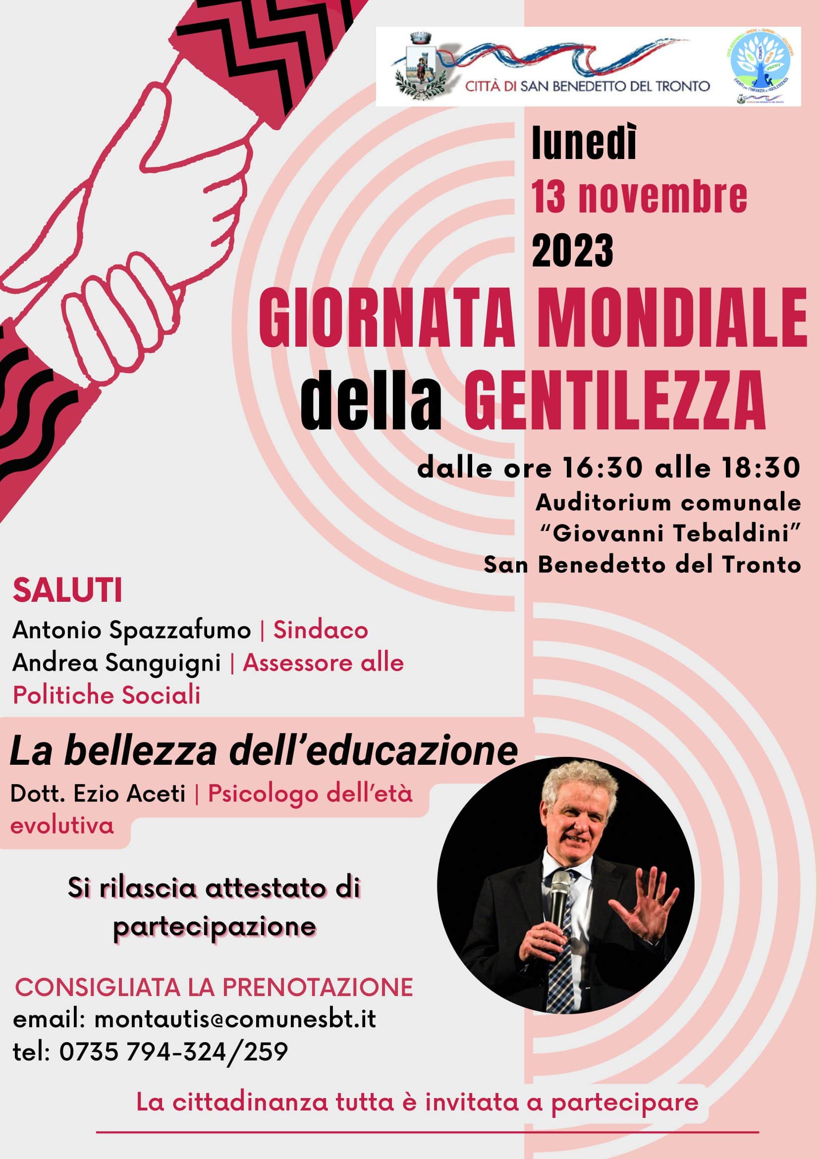 SAN BENEDETTO DEL TRONTO – Lunedì 13 novembre il Comune di San Benedetto festeggia la Giornata Mondiale della Gentilezza ospitando all’Auditorium comunale “Giovanni Tebaldini” la conferenza intitolata “La bellezza dell’educazione”, tenuta dal dr. Ezio Aceti.
