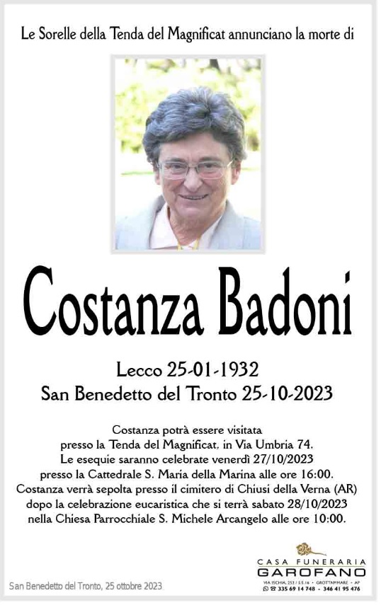 SAN BENEDETTO DEL TRONTO – Costanza Badoni della “Tenda del Magnificat” è tornata alla Casa del Padre.
