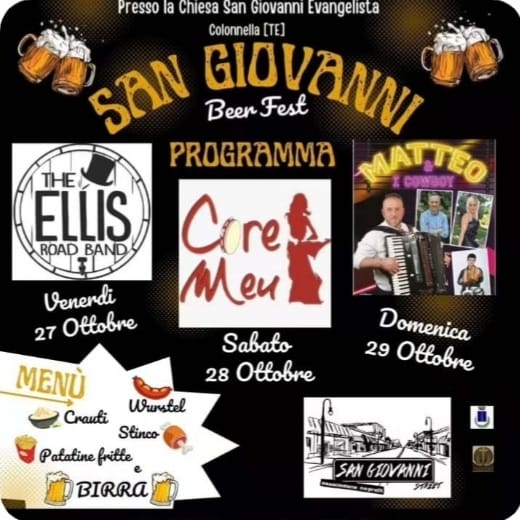 COLONNELLA – Prosegue a gonfie vele la “Festa della Birra” organizzata dall’associazione “San Giovanni Street” di Colonnella. L’evento, iniziato venerdì 27 e proseguito ieri, sabato 28, terminerà stasera, domenica 29 ottobre, dalle ore 20:00 in poi, presso il piazzale antistante la chiesa San Giovanni Evangelista in Colonnella.