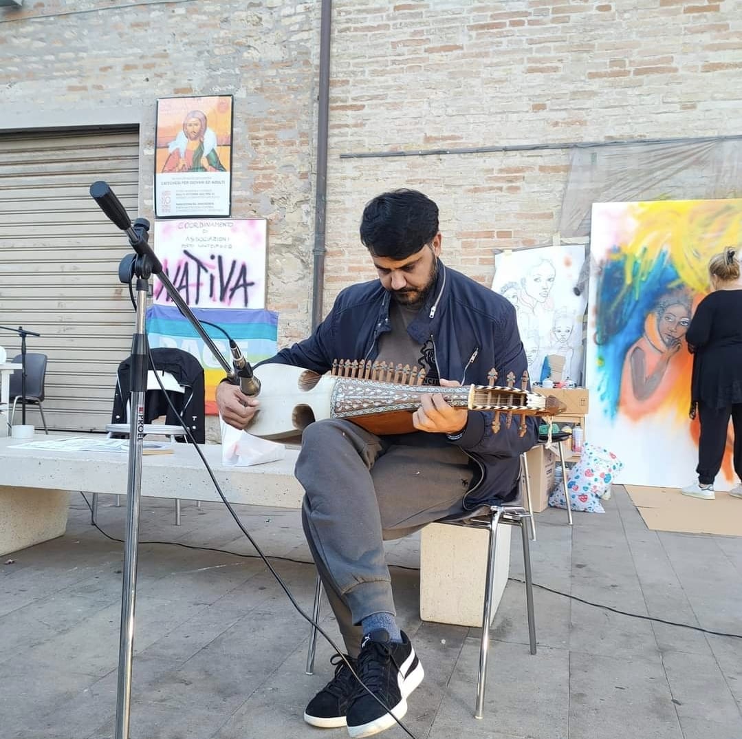 “È uno strumento a corde, tipico del Pakistan, che ho portato con me. Si chiama rabab. È come una chitarra ed è molto usato nel mio paese. Suono questo strumento popolare che mi tiene legato alle mie origini.