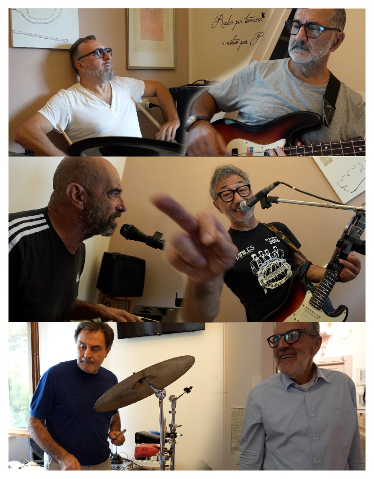 Trasportati all’unisono da una comune corrente, la musica, si ritrovarono in un cascinale immerso nella campagna grottammarese per esprimere le loro bollenti repressioni emulando gli artisti di quel tempo. Diversi concerti li portarono ad un contatto diretto con la loro generazione. Incisero i loro brani e iniziarono a diffonderli. Poi le cose cambiano, il tempo colma gli spazi, c’è chi si ritrova professionista nel campo della musica e chi in altri campi ma tutti con la loro professione portata al massimo livello. Nessuno di loro scorderà i sogni di quei tempi e tutti continueranno a coltivare le proprie passioni musicali, tanto da riportarli tutti sul palco dopo tanti, tanti anni ma ancora con tutta la voglia di fare buona musica della “Nuova generazione” di ieri e di oggi, con ancora tanta voglia di essere giovani.