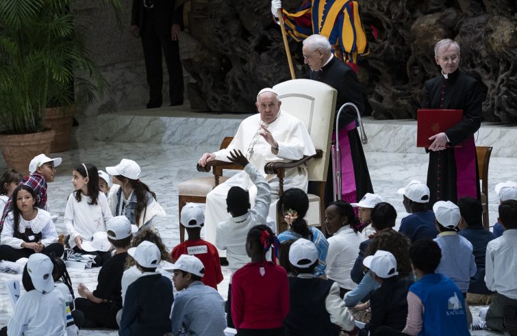 Un botta e risposta serrato che ha coinvolto direttamente tutti i presenti chiamati, più volte, a ripetere gesti e parole del Pontefice. Un incontro che si è aperto con il brano “Supereroi” cantato da Mr Rain e intonato dai bambini radunati nell’Aula Paolo VI.