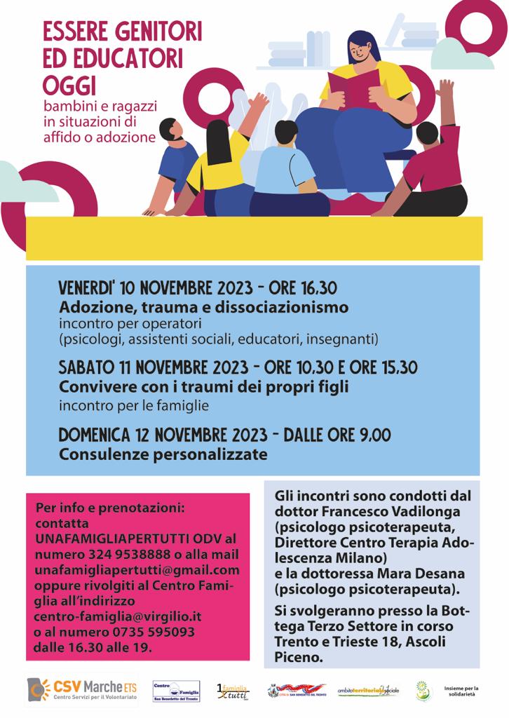 ASCOLI PICENO – Saranno tre le giornate dedicate all’evento “Essere genitori ed educatori oggi – Bambini e ragazzi in situazioni di affido o adozione”, organizzato dall’organizzazione di volontariato “Una famiglia per tutti odv” e dal “Centro Famiglia” di Ascoli Piceno: venerdì 10, sabato 11 e domenica 12 Novembre.