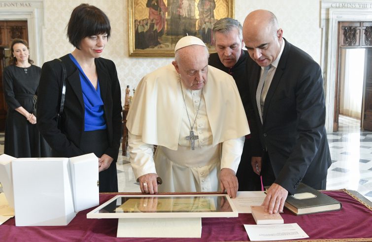 “Durante i cordiali colloqui in Segreteria di Stato – informa la Sala Stampa della Santa Sede – è stato espresso compiacimento per le buone relazioni tra la Santa Sede e la Confederazione Elvetica, rilevando il fedele e professionale servizio al Santo Padre della Guardia Svizzera Pontificia e auspicando l’incremento della collaborazione reciproca negli ambiti di comune interesse”. “Nel prosieguo dell’incontro – si legge ancora nel comunicato – ci si è soffermati su alcune problematiche di carattere internazionale, con speciale riferimento alla situazione in alcuni Paesi dell’Africa, ai conflitti in Ucraina e in Israele e Palestina, e al conseguente impegno per il multilateralismo e la pace tra i popoli”. Il Papa ha donato al presidente svizzero un’opera in bronzo dal titolo “Amore sociale”, raffigurante un bimbo che aiuta un altro a rialzarsi, con la scritta “Amare Aiutare”, oltre al Messaggio per la Pace di quest’anno, al Documento sulla Fratellanza Umana e al libro sulla Statio Orbis del 27 marzo 2020, a cura della Lev. Il presidente svizzero ha donato al Santo Padre una copia del bollettino meteorologico svizzero del 29 luglio 1921, giorno di caldo così insolito all’epoca a Ginevra da ispirare il volume “Présence de la mort” di C.F. Ramuz.