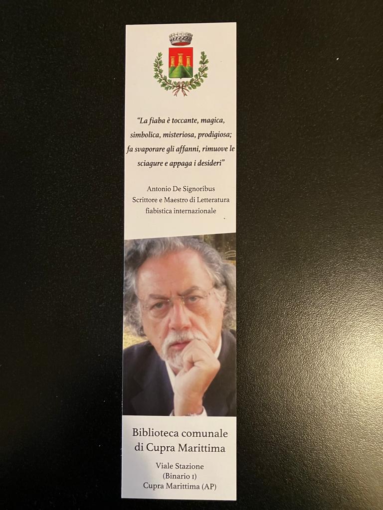 CUPRA MARITTIMA – È uscito a cura della Biblioteca Comunale di Cupra Marittima il nuovo segnalibro con una bellissima frase sulla fiaba di Antonio De Signoribus, Scrittore, Maestro di Letteratura fiabistica internazionale, oltreché filosofo, e grande studioso di Cultura orale.