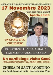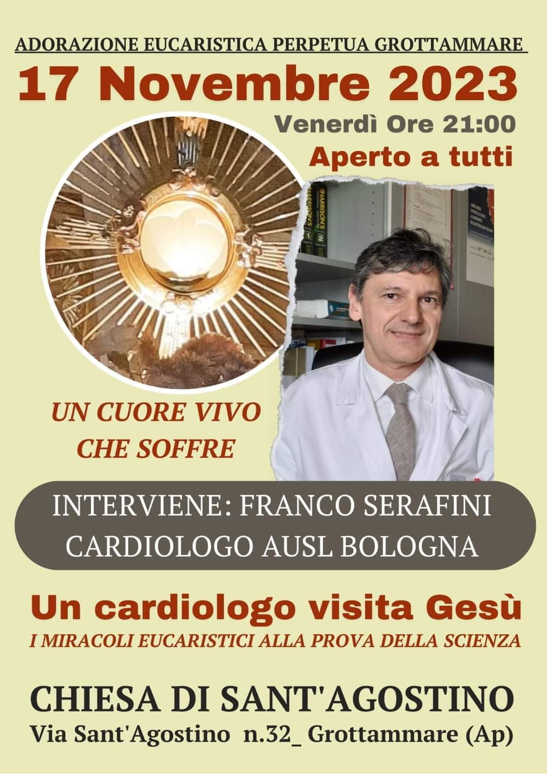 GROTTAMMARE – Si terrà venerdì 17 novembre 2023, alle ore 21:00, presso la chiesa di Sant’Agostino in Grottammare, un incontro dal titolo “Un cardiologo visita Gesù – I miracoli eucaristici alla prova della scienza“. L’appuntamento, organizzato dal Gruppo di Adorazione Eucaristica Perpetua di Grottammare, registrerà la presenza del dott. Franco Serafini, cardiologo della AUSL di Bologna, il quale esaminerà cinque miracoli eucaristici alla prova della scienza, quindi attingendo ai dati ed alle tecniche scientifiche più recenti.