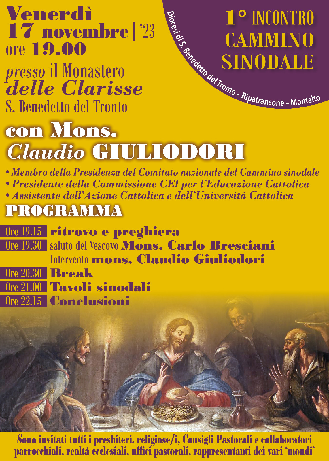 DIOCESI – Oggi, venerdì 17 novembre, alle ore 19.00 avrà inizio presso il Monastero delle Sorelle Clarisse di San Benedetto del Tronto, il 1° incontro del cammino sinodale della diocesi di San Benedetto del Tronto – Ripatransone – Montalto, con il Vescovo Claudio Giuliodori. Leggi la notizia, clicca qui