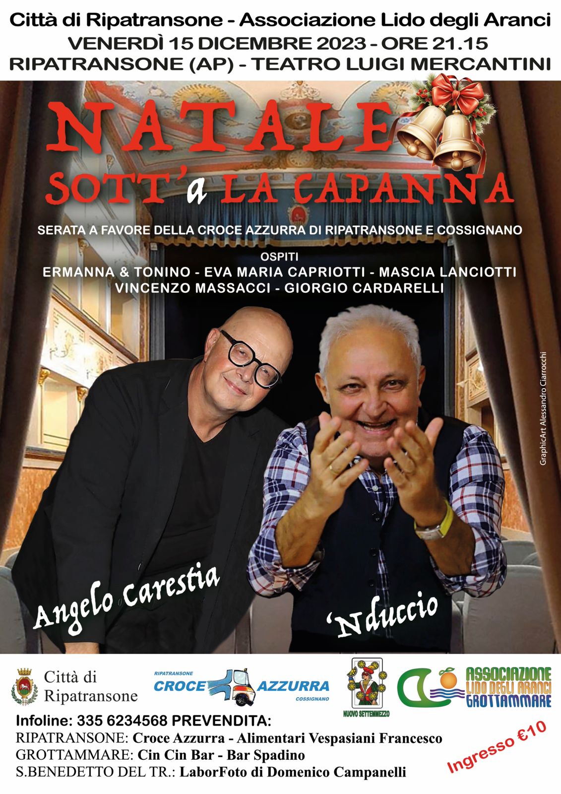 Ma con questo grande evento non si chiude l’attività 2023 del Lido. Infatti il 15 dicembre a Ripatransone al meraviglioso teatro Mercantini, ci sarà il Gran Gala’ della Croce Azzurra di Ripatransone e Cossignano, con l’evento comico, poetico e musicale “Natale Sott’a la capanna” con ‘Nduccio, Angelo Carestia, i menestrelli Ermanna e Tonino e i poeti dialettali e locali Eva Maria Capriotti, Vincenzo Massacci, Giorgio Cardarelli, Mascia Lanciotti. Appuntamento imperdibile al prezzo popolare di 10 euro. Info e prenotazioni all’Associazione Lido degli Aranci, al 335.6234568. Non mancate, con la LdA il divertimento è assicurato.