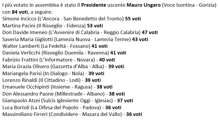 Il più votato in assemblea è stato il Presidente uscente Mauro Ungaro (Voce Isontina – Gorizia) con 84 voti, a seguire: