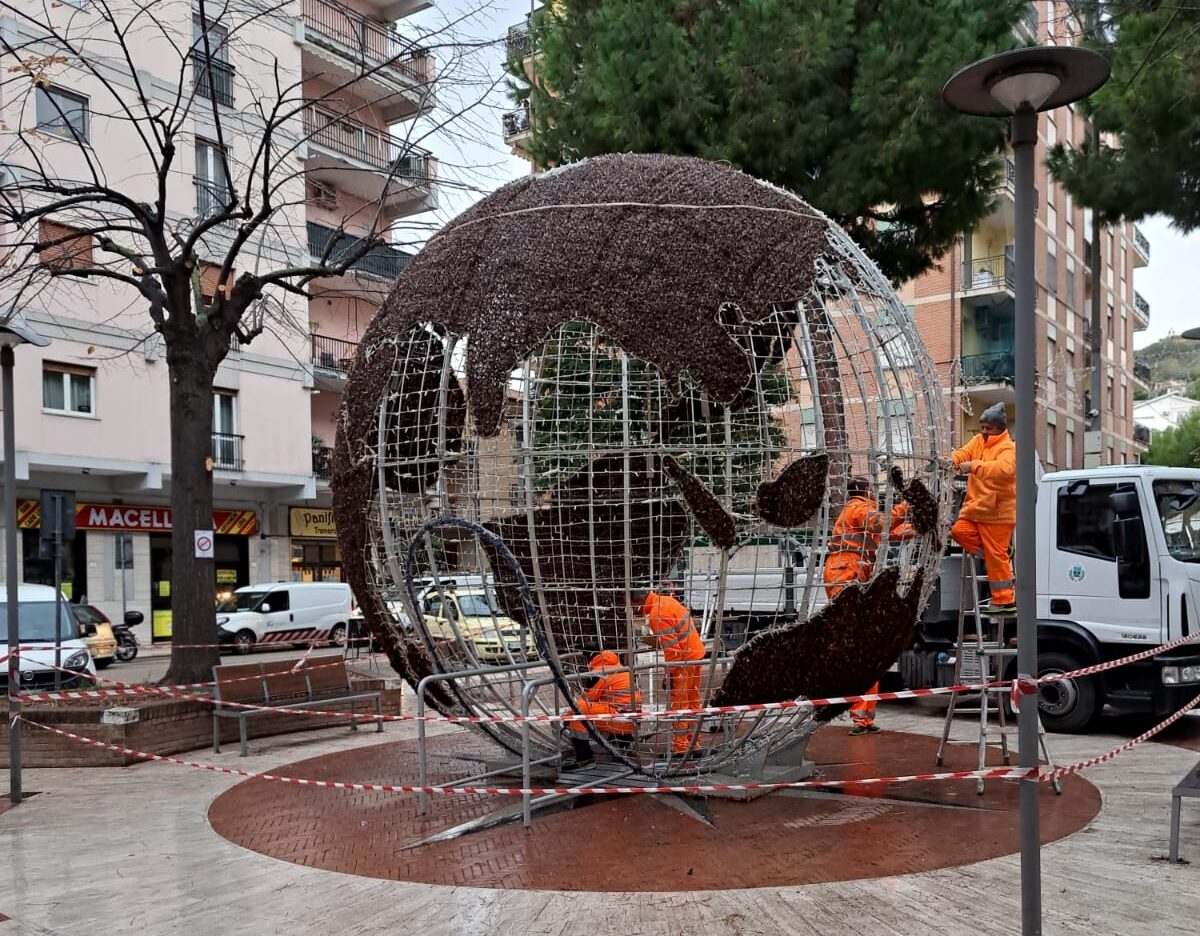 GROTTAMMARE – Per il Natale 2023, il mappamondo luminoso “DreamWorld” cambia sede: è in corso da questa mattina il montaggio della luminaria nel cuore di Zona Ascolani, piazza Carducci.