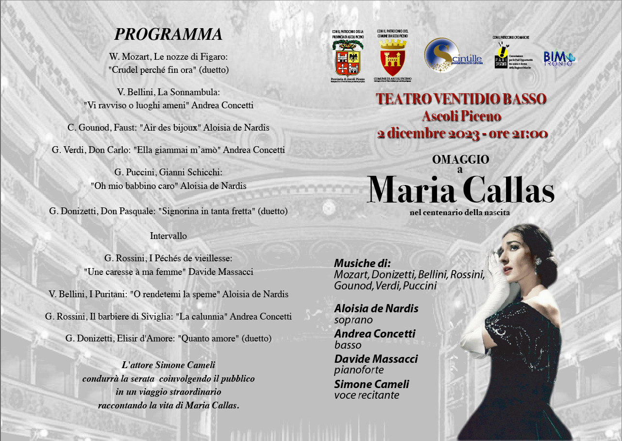 ASCOLI – L’Associazione Culturale “Scintille” ha l’onore di presentare un prestigioso evento, unico nella Regione Marche, che nasce come omaggio al centenario della nascita di Maria Callas, celebre interprete del repertorio lirico dello scorso secolo. Infatti, il debutto è previsto per domani, sabato 2 dicembre 2023, esattamente a 100 anni dalla nascita della “Divina”, una serata speciale dedicata a Maria Callas, il mito, la leggenda, colei che ha cambiato per sempre il mondo dell’opera lirica. Lei stessa ha scritto “Cantare, per me, non è un atto d’orgoglio, ma solo un tentativo d’elevazione verso quei cieli dove tutto è armonia”.