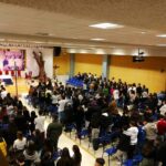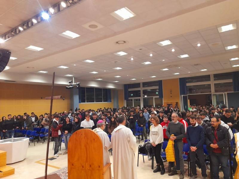 DIOCESI – Un cammino percorso con gioia alla ricerca della speranza. Possiamo riassumere così la Giornata Mondiale della Gioventù della Diocesi di San Benedetto del Tronto – Ripatransone – Montalto che si è svolta venerdì 1 dicembre alle ore 20:30 a Centobuchi. Del resto il tema scelto da Papa Francesco per la GMG Diocesana, tratto dalla Lettera di San Paolo ai Romani, è proprio l’espressione “Lieti nella speranza” (Rm 12, 12) che mette al centro dell’attenzione i due sentimenti che hanno caratterizzato la serata: la gioia e la speranza. Obiettivo centrato dunque, anche a giudicare dalla riuscita dell’evento che ha registrato la partecipazione di più di 350 tra adolescenti e giovani, oltre che del vescovo, Mons. Carlo Bresciani, del responsabile diocesano della Pastorale Giovanile e Vocazionale, don Matteo Calvaresi, e di numerosi altri sacerdoti della Diocesi che hanno accompagnato i giovani all’incontro.