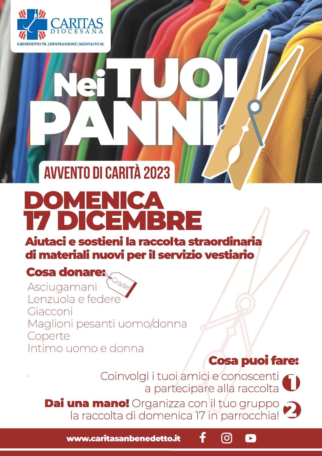 Invitiamo le persone a partecipare attraverso: “la raccolta straordinaria di vestiario per la Caritas diocesana ed alcune Caritas parrocchiali per domenica 17 dicembre in occasione dell’Avvento di Carità. Materiale nuovo: intimo, asciugamani, lenzuola e federe, giacconi, maglioni uomo/donna, coperte.