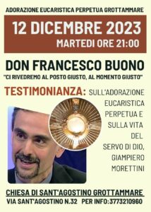 GROTTAMMARE – “Nell’Adorazione Perpetua tanti vengono ad offrire le proprie sofferenze e a intercedere per gli altri e, in un mondo che spesso ci distrae e ci disperde, ritrovano la Luce, ritrovano in Gesù Eucarestia il centro della propria vita. Questo è quello che è successo anche a Giampiero, che, ad un certo punto della sua vita, ha iniziato a correre con Dio. Sì, proprio correre, perché Dio ha fretta di farci Santi e Giampiero è diventato straordinario nella sua semplicità e nella quotidianità”. È con queste parole che don Francesco Buono, parroco, padre spirituale e postulatore della causa di canonizzazione del giovane Giampiero Morettini, presenta l’incontro dal titolo “Ci rivedremo al posto giusto, al momento giusto”, che si terrà martedì 12 Dicembre 2023, alle ore 21:00, presso la chiesa di Sant’Agostino in Grottammare. L’evento, organizzato dalla Comunità dell’Adorazione Eucaristica Perpetua, è il secondo di una serie di appuntamenti pianificati in occasione del 10°Anniversario dalla sua istituzione avvenuta il 16 Febbraio 2013.
