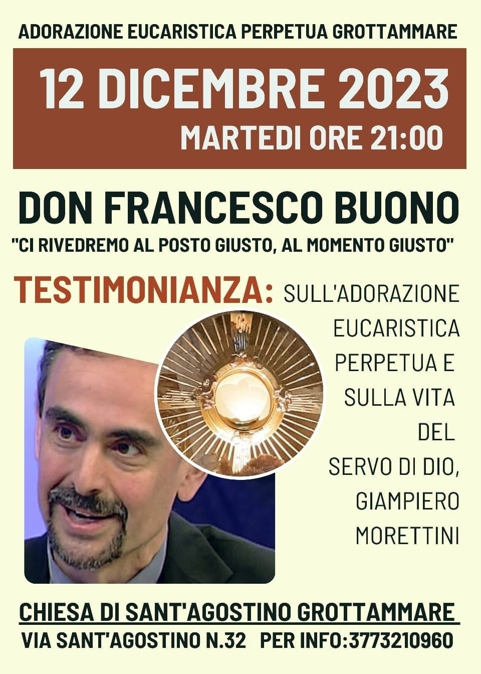 Giulia Damiani, della Comunità dell’Adorazione Eucaristica Perpetua a Grottammare, dichiara: “Per ringraziare Dio, continueremo questo cammino con la nostra guida spirituale, don Giorgio Carini, avendo la grazia di ospitare nella nostra Diocesi don Francesco Buono, appassionato della predicazione dei Dieci Comandamenti, promotore dell’Adorazione Eucaristica perpetua, di cammini per giovani e adulti, fidanzati e sposati, e anche giudice presso il Tribunale Ecclesiastico. A Grottammare don Francesco testimonierà la vita del Servo di Dio Giampiero Morettini, un ragazzo dei nostri giorni, il Santo della porta accanto, che, come molti giovani, oggi, dopo la Cresima, si è allontanato dai Sacramenti ma, attraverso, una missione al popolo nel Paese di don Francesco, ha rincontrato Gesù ed è tornato all’ovile, diventando poi Ministro Straordinario della Comunione e Seminarista. Con lui, ad accompagnarlo, ci saranno i genitori di Sara Mariucci, una bambina salita in Cielo a soli quattro anni, che porta speranza nei sofferenti, in chi ha paura e in chi ha perso la fede. Affidiamo alla Madonna questo incontro, affinché porti i frutti di conversione e rivitalizzazione di Fede in chi è già in cammino. Con don Giorgio vogliamo ringraziare il parroco delle parrocchie di San Giovanni Battista e San Pio V, Mons. Federico Pompei, che ha collaborato affinché tutto questo potesse accadere”.
