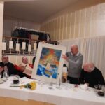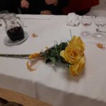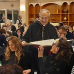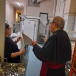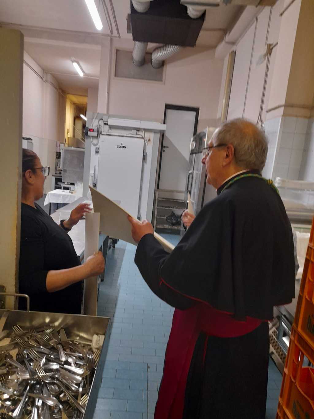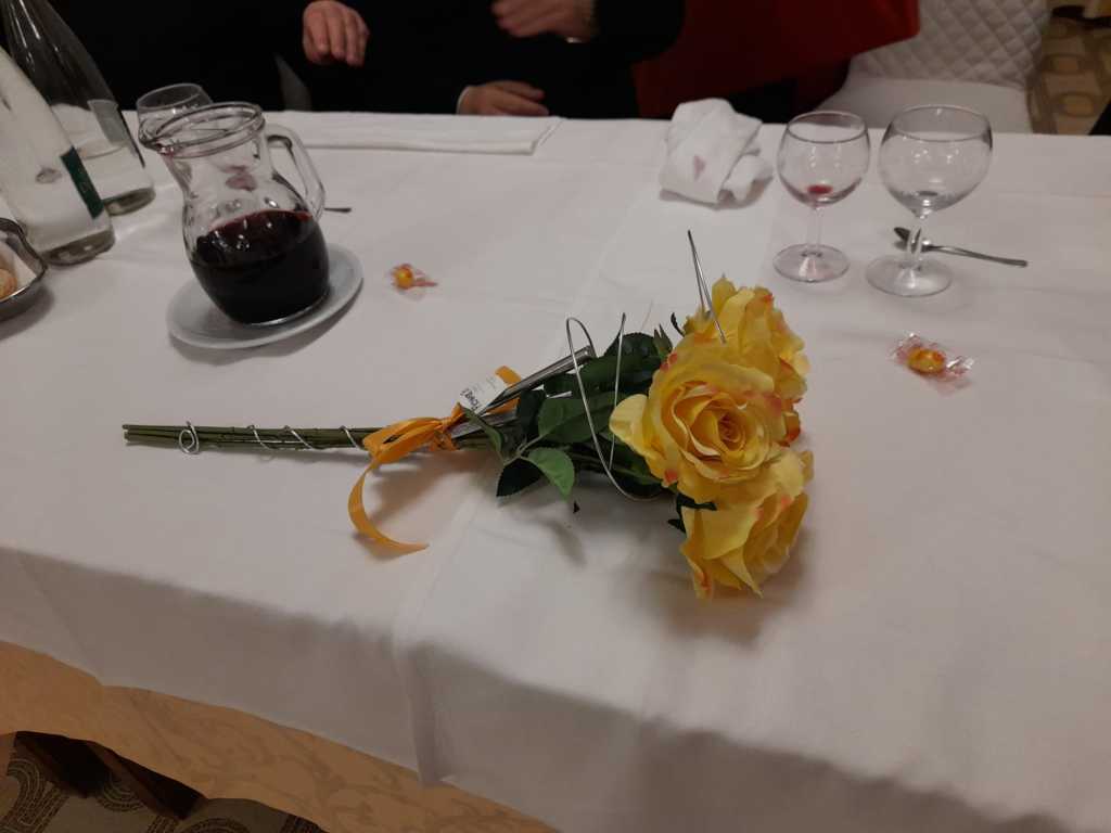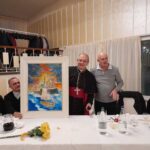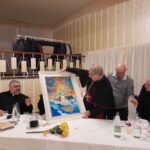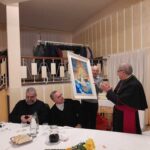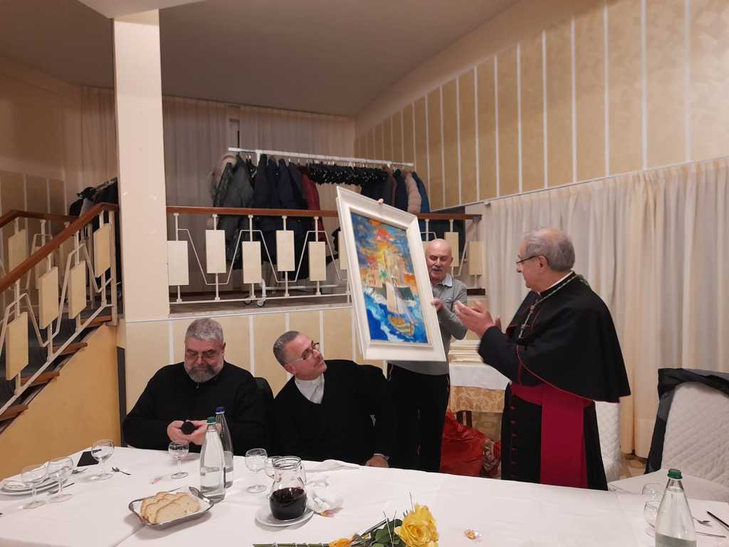 Mons. Bresciani, dopo aver ringraziato per il dolce pensiero, ha poi consegnato a tutti i presenti, sia i commensali ospiti sia gli operatori del ristorante – quindi cuochi, camerieri ed albergatori – un suo piccolo dono, in segno di gratitudine per i festeggiamenti ricevuti. Queste le parole del Vescovo Bresciani: “Si tratta di una stampa d’arte realizzata dall’artista don Giorgio Carini, riguardante i discepoli di Emmaus, scelti come icona biblica della fase sapienziale del cammino sinodale. Oltre che essere un ricordo di questa bellissima serata, l’opera indica anche il nostro cammino come Chiesa“.