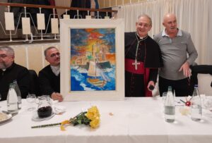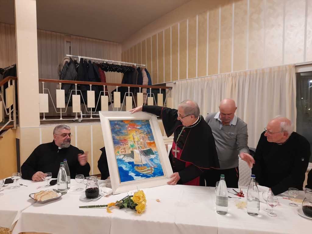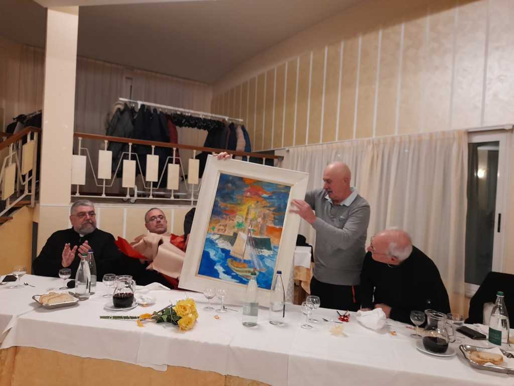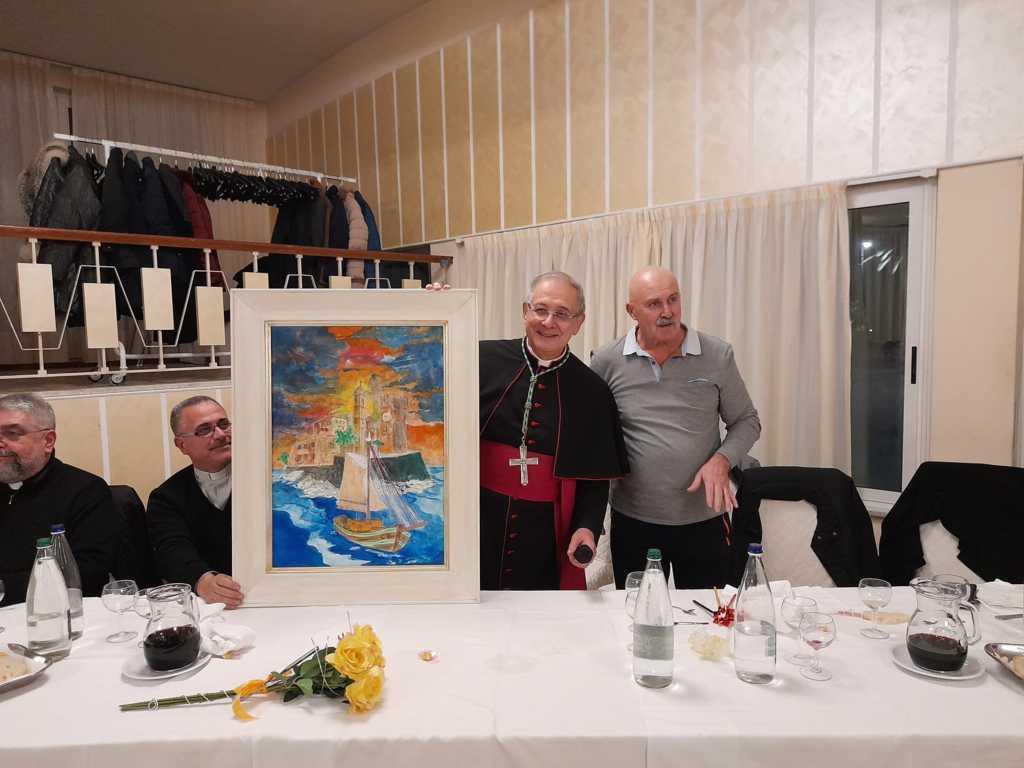 Prima del dolce, l’artista Patrizio Moscardelli ha consegnato al Vescovo un dipinto a lui commissionato dai giovani della Diocesi per omaggiare Bresciani nel suo anniversario di ordinazione episcopale. L’artista ha spiegato così la simbologia dell’opera: “Il paesaggio richiama le nostre origini e la bellezza del territorio; il borgo rimanda alle nostre piccole comunità e alle loro tradizioni, mentre il mare simboleggia la grande fatica dei pescatori, quindi le paure e le fragilità umane. La barca è la Chiesa che naviga ed accoglie tutti, accompagnando l’umanità nella traversata della storia. Suo punto di riferimento è il Sole che sorge dall’alto e che rappresenta Dio che instancabilmente illumina la nostra vita. Dentro l’imbarcazione c’è anche lei, Eccellenza, che, in maniera discreta ed intelligente, incoraggia la comunità diocesana e le indica la rotta, come faceva Gesù con i suoi discepoli”.