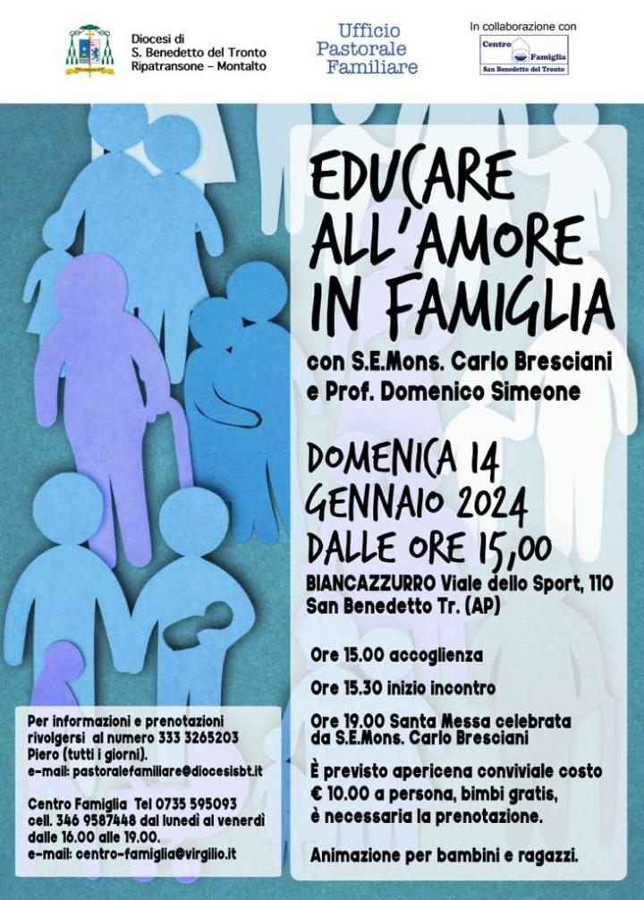 SAN BENEDETTO DEL TRONTO – Domenica 14 gennaio, dalle ore 15:00, presso il Centro Biancazzurro, sito in Viale dello sport 110 a San Benedetto del Tronto si terrà l’incontro “Educare all’amore in famiglia”. Il pomeriggio è organizzato dalla Pastorale familiare e dal Centro famiglia.