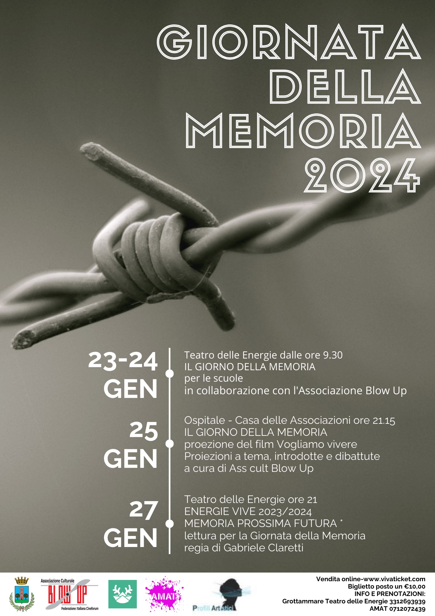 Sabato 27, la ricorrenza si interseca con la prima data della stagione teatrale “Energie Vive”. Lo spettacolo “Memoria prossima futura” è una lettura per la Giornata della Memoria per la regia di Gabriele Claretti. Per l’occasione, la direzione artistica, che fa capo all’associazione Profili artistici, ha stabilito di devolvere in beneficenza l’incasso della serata ai progetti culturali dell’associazione “Ho una idea” (biglietto 10 €, www.vivaticket.com. Info: 3312693939 – Amat: 0712072439).