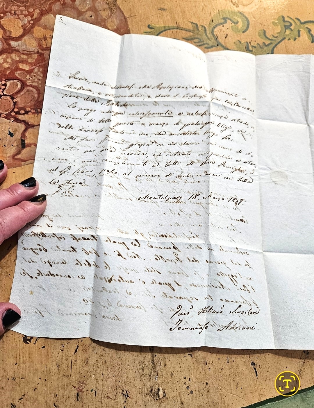 Partita dalla Prefettura di Montelparo da Tommaso Adriani e indirizzata a Giuseppe Laurantoni, la missiva, scritta con penna e calamaio su un bel foglio filigranato con un cerchio con dentro un’aquila rampante ad ali spiegate che poggia con una sola zampa sul più alto di tre monti, parla di un’ipoteca, cambiale insomma dei censi delle Confraternite ed azioni relative ad esse.