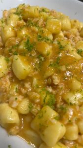 È un piatto che propongo al mio ristorante: degli gnocchetti fatti in casa con mazzancolle dell’Adriatico, datterino giallo, bisque, zest di lime e basilico. Un mix tra tradizione, prodotti del territorio e sapori contrastanti