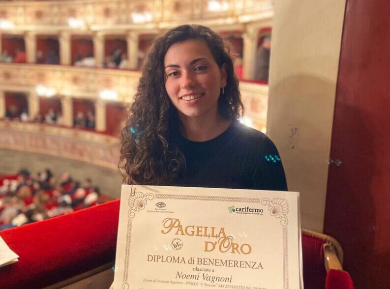 SAN BENEDETTO DEL TRONTO – Frequenta l’Istituto di Istruzione Superiore “F. Buscemi” la studentessa Noemi Vagnoni che nelle scorse settimane ha ritirato, al Teatro dell’Aquila di Fermo, la Pagella d’Oro giunta quest’anno alla sessantunesima edizione.