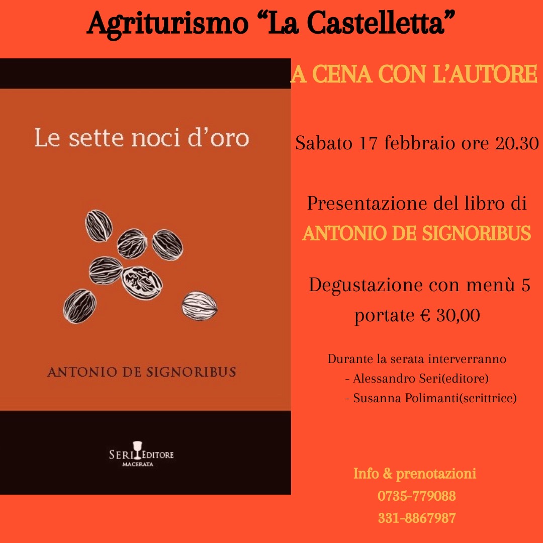 L’autore è il noto scrittore e studioso Antonio De Signoribus, che presenterà il suo il suo ultimo libro, ovvero “ Le sette noci d’oro” edito da Seri di Macerata. Si tratta di una raccolta molto importante per l’uso incredibile della fantasia, per la struttura, e per l’uso della lingua che la rende riconoscibile, fin dalle prime parole. Le successioni delle azioni e la loro durata sono rese, poi, con la ripetizione di sequenze , frasi, immagini, situazioni che diventano inconfondibili in questo nuovo straordinario lavoro di Antonio De Signoribus, che è un maestro in questo genere letterario per il quale è stato chiamato a darne testimonianza in tutte le più importanti rassegne letterarie nazionali e internazionali. Per l’occasione l’Agrichef Gabriella Rosa proporrà piatti tipici della tradizione contadina, alcuni ispirati, in perfetta simbiosi, alle fiabe del nostro Antonio De Signoribus. Serata,dunque, da non perdere. Serata magica, da gustare in tutti i sensi.