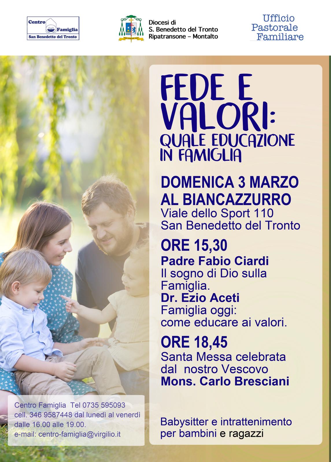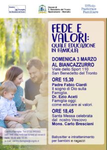 DIOCESI – Si terrà Domenica 3 Marzo, presso i locali del Biancazzurro in San Benedetto del Tronto, l’incontro dal titolo “Fede e valori: quale educazione in famiglia“. L’evento, organizzato dalla Diocesi di San Benedetto del Tronto – Ripatransone – Montalto, dal Centro Famiglia di San Benedetto del Tronto e dall’Ufficio di Pastorale Familiare, registrerà la partecipazione del vescovo diocesano, Mons. Carlo Bresciani, del dott. Ezio Aceti, psicologo e formatore, e di padre Fabio Ciardi, teologo e scrittore.