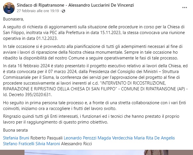 RIPATRANSONE – Dopo un silenzio di più di un anno, su facebook, ritorna un comunicato del Sindaco di Ripatransone riguardante la Chiesa Monumentale di San Filippo Neri. Riletti tutti i precedenti datati fino al 30 agosto 2022, il cittadino svezzato pensa se per caso ci fosse in calendario programmato qualche altra votazione visto che in precedenza il problema del ripristino della Chiesa Monumentale di San Filippo era risolto con tanto di, scrive il Sindaco in data 20/7/22 e ribadito il 28/7/22: “Il progetto che prevede l’intervento sia interno che esterno all’edificio ,è stato approvato e finanziato con specifica copertura economica”.