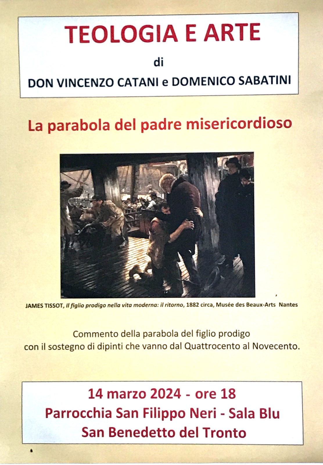 SAN BENEDETTO DEL TRONTO – “Forse è azzardato ma è entusiasmante quello che si propone: unire la riflessione teologica all’arte. La riflessione teologica aiuta a leggere in modo più profondo l’opera d’arte e molti suoi significati nascosti nelle pieghe di una iconografia spesso molto personale; l’arte da parte sua materializza e concretizza nel bello e comunque nella genialità di un artista le idee teologiche che spesso rimangono su un piano di necessaria astrattezza”. Con queste parole Mons. Vincenzo Catani presenta la serata che si terrà giovedì 14 marzo, alle ore 18.00, presso la parrocchia di San Filippo Neri a San Benedetto del Tronto, dal titolo: “La parabola del Padre Misericordioso”