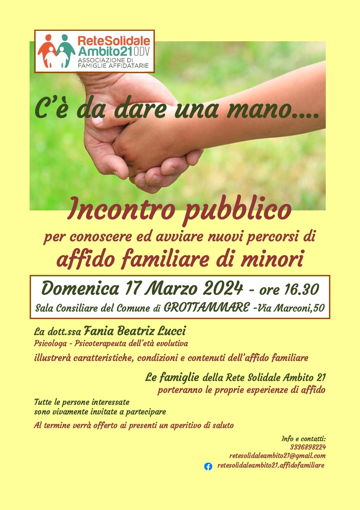 GROTTAMMARE – E’ questo l’obiettivo dell’incontro che si terrà Domenica 17 Marzo 2024 alle ore 16.30 presso la Sala Consiliare del Comune di Grottammare a cura dell’associazione di famiglie affidatarie “Rete Solidale Ambito21 OdV”.