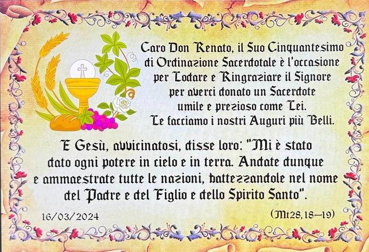 Carissimo Padre Renato, tanti... tantissimi AUGURI per questi primi CINQUANT'ANNI di SACERDOZIO (detto bene... i primi 50 anni, perché il Movimento dei Cursillos di Cristianità, ma soprattutto il Signore, hanno tanto bisogno ancora di te!).