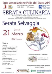 MONTEPRANDONE – Giovedì 21 marzo presso il ristorante “Dimora di Bacco” di Monteprandone, sarà servita la “Serata selvaggia”, serata culinaria dedicata alla cacciagione, organizzata dall’Ente Palio del Duca aps.