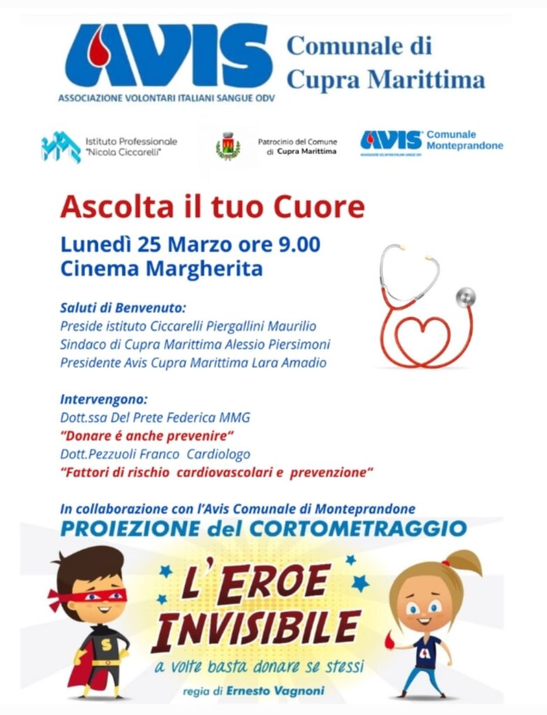 Al termine dell’iniziativa verrà proiettato il cortometraggio realizzato dall’Avis comunale di Monteprandone “L’ Eroe invisibile” a volte basta donare se stessi realizzato dal regista Ernesto Vagnoni. L’ evento è aperto a tutta la cittadinanza.