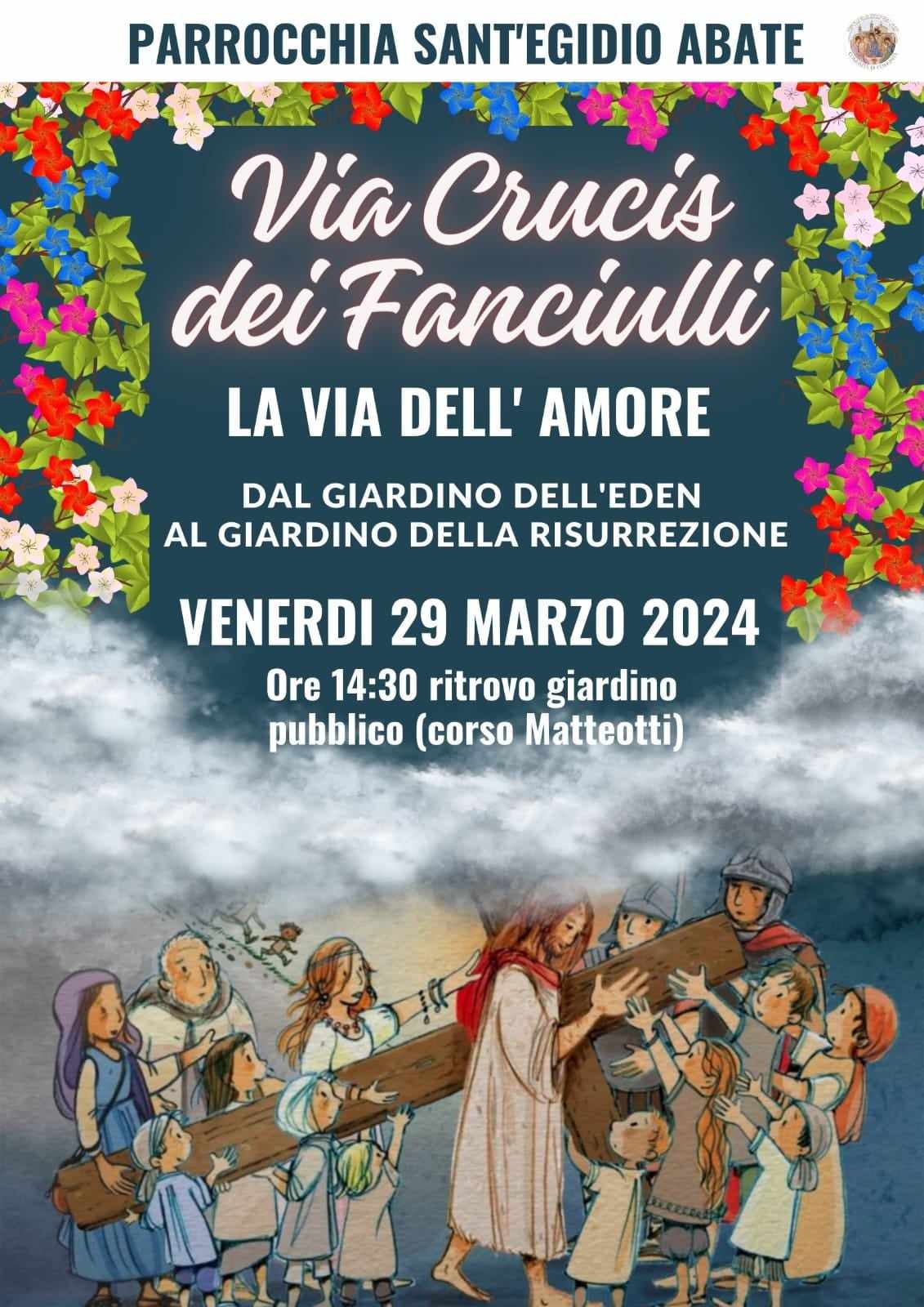 SANT’EGIDIO ALLA VIBRATA – La comunità di Sant’Egidio alla Vibrata si appresta ad affrontare la Settimana Santa con numerosi appuntamenti; quest’anno i catechisti sono lieti di presentare la prima “Via Crucis dei fanciulli”, che si terrà il prossimo 29 Marzo alle ore 14.30, con percorso che si snoderà per le vie ed i giardini della cittadina;