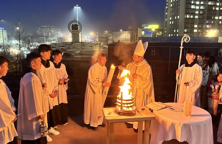 Ogni parrocchia vive il Triduo Santo curando bene le liturgie e ospitando il vescovo, che cerca di farsi presente almeno nelle comunità della capitale. Arriva la notte santa. Il fuoco scoppietta all’interno dell’alare tradizionale, simbolo della famiglia. Tutt’intorno il traffico congesto e le luci intermittenti della città, per lo più ignara di quanto sta accadendo. La cattedrale a forma di ger (la tenda mongola) è avvolta nel buio, che si dirada all’ingresso della processione con il cero e le candele dei fedeli. L’exsultet è cantato in lingua mongola; con le sue immagini poetiche, ricorda le composizioni liriche della tradizione locale. Da lì a poco i catecumeni si avvicineranno al fonte battesimale e vestiranno il bianco della vita nuova; qualcuno arriva con il deel (abito tradizionale) fatto apposta per l’occasione. Qualche lacrima di commozione, molto contegno e tanta gioia, anche senza grandi manifestazioni esteriori.