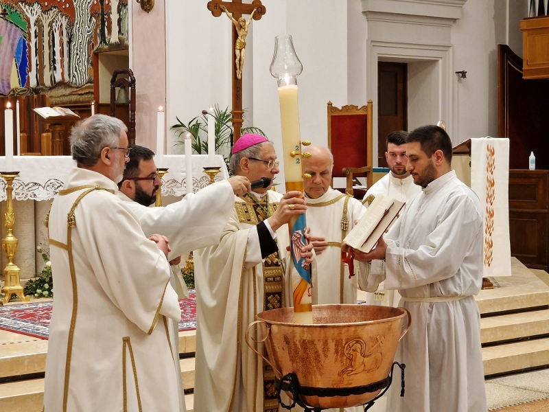 La Veglia pasquale si è svolta in quattro “momenti” il Lucernario, con la benedizione del fuoco, l’accensione del cero e la processione; la Liturgia della Parola, caratterizzata da sette letture; la Liturgia battesimale, il rinnovo delle promesse battesimale e l’aspersione dell’acqua benedetta e la liturgia Eucaristica, con la quale i fedeli hanno partecipato sacramentalmente al mistero della morte e resurrezione di Cristo.