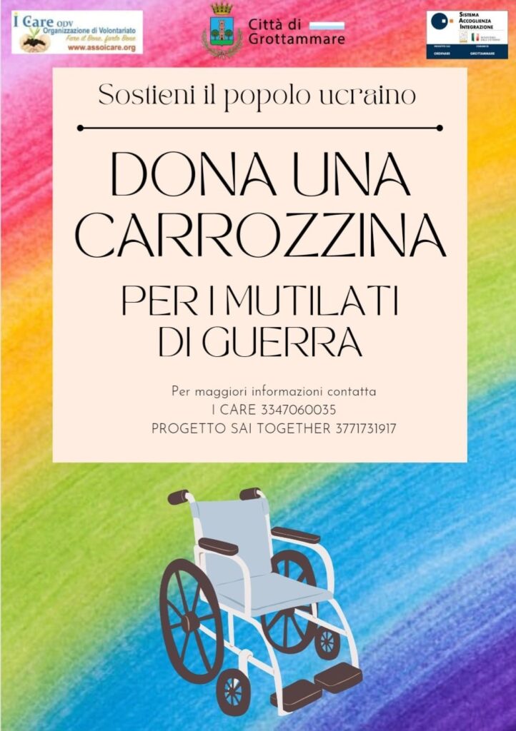GROTTAMMARE – La comunità ucraina presente in città, in collaborazione con il Progetto SAI-Sistema accoglienza e integrazione Together Grottammare, promuove una campagna di solidarietà per la raccolta di carrozzine usate per disabili da destinare ai mutilati della guerra che si sta consumando nella terra di origine. L’iniziativa ha il patrocinio dell’Amministrazione comunale e il supporto dell’associazione I Care per gli aspetti logistici della raccolta.